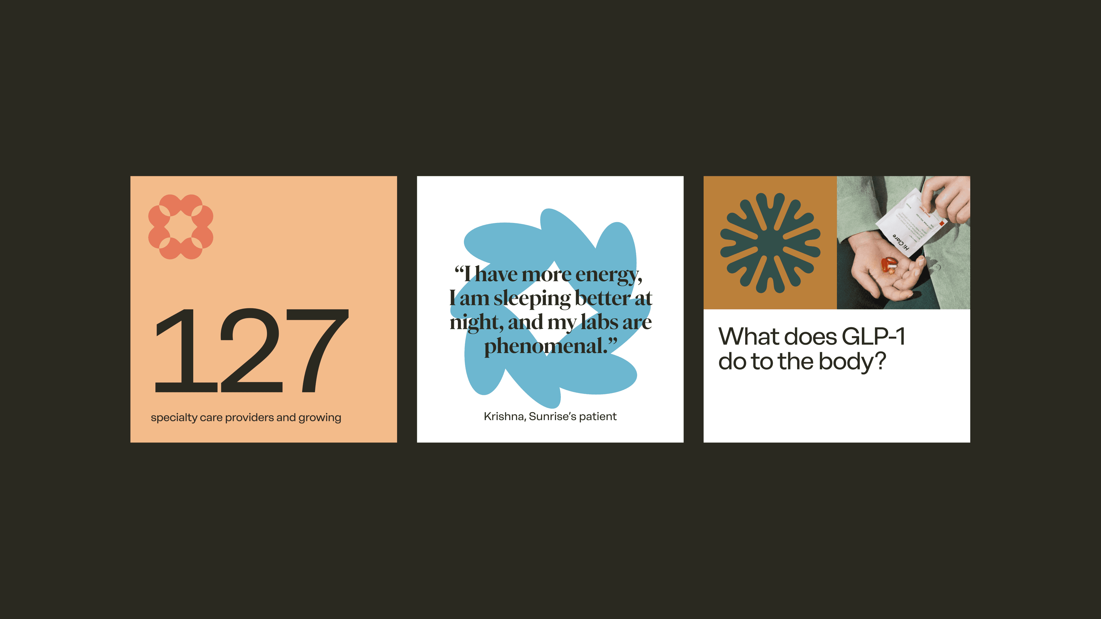 The mission of Sunrise Health is to ensure that the highest quality specialty care is accessible to everyone, starting with clinical weight loss. The design system that has been created is meant to evoke an open ecosystem of care. Each symbol shows individuality in treatment, but when shown together they represent a wide network of medical service. As an Sr. Designer/Art Director on this project, I helped to develop the look and feel of this brand through multiple rounds of design directions presented to the client. Once a final route was chosen I then assisted in the creation and refinement of the final brand guidelines.